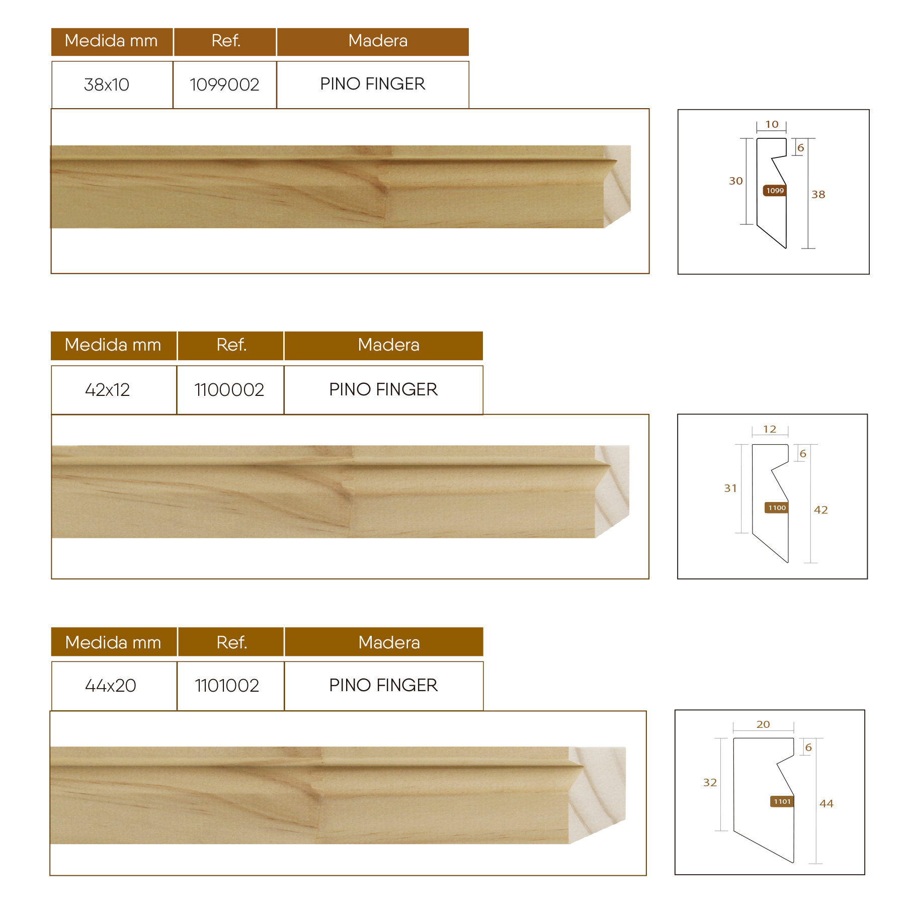 3 medidas de bastidor de 38x10mm, 42x12mm y 44x20mm.