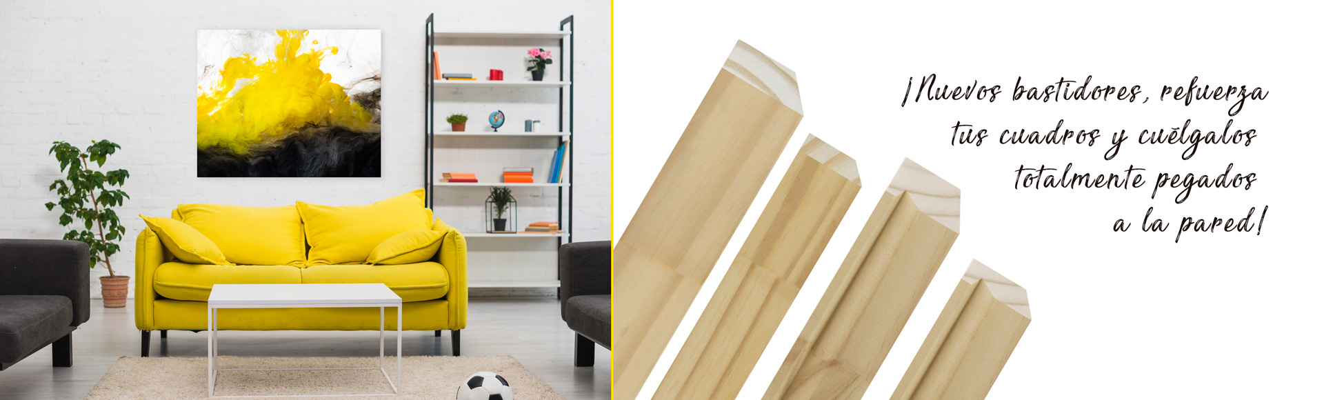 Bastidores de pino finger especialmente diseñados para colgar fácilmente en la pared cualquier tipo de cuadro, bastidor, D-Fix, Cartón Pluma u otros materiales. El plano inclinado del bastidor hace que el cuadro quede completamente pegado a la pared y recto. También lo podemos utilizar como refuerzo de cuadros de gran formato.